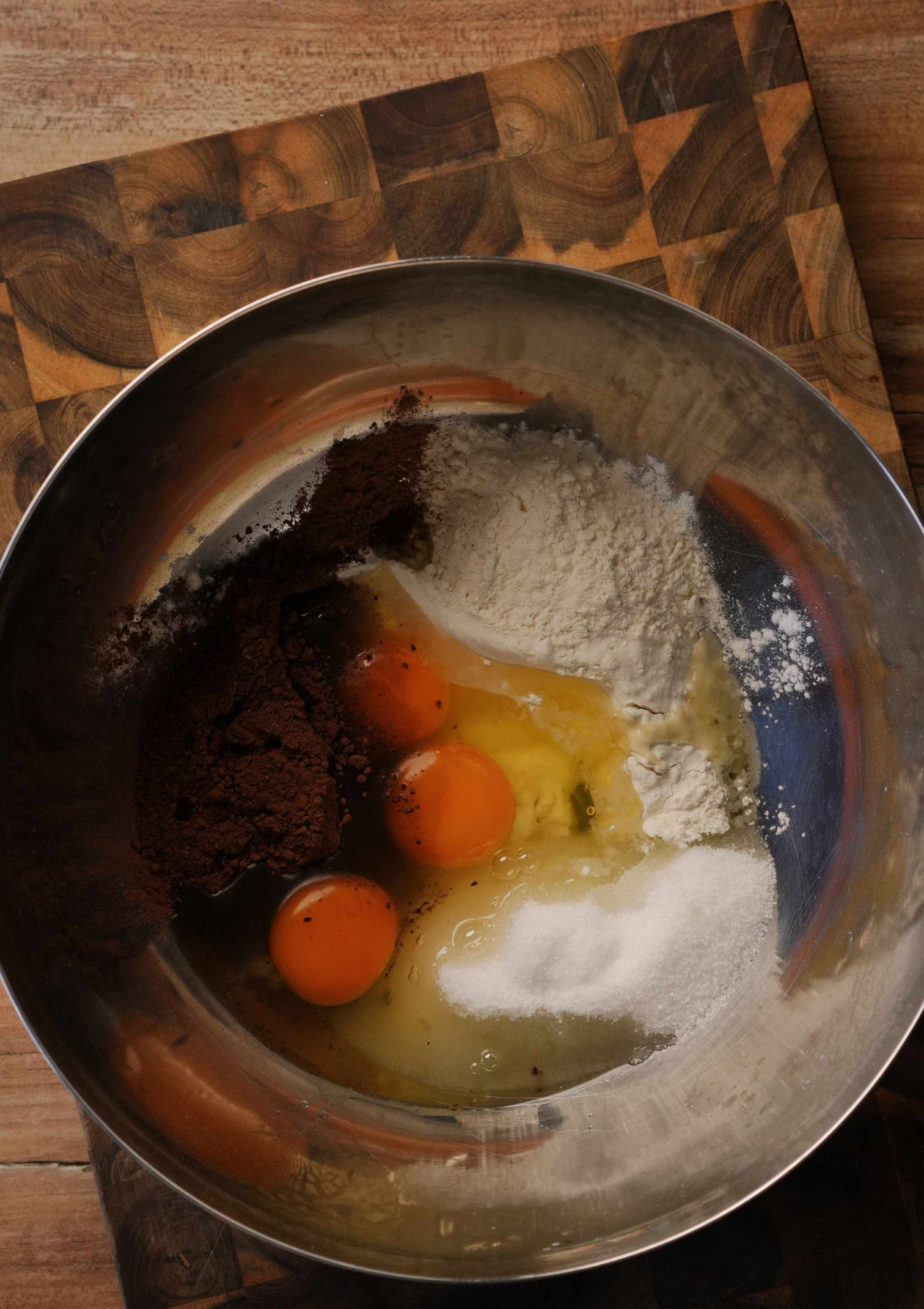 Zucker, Mehl, Backkakao, Spekulatiusgewürz und Eier in einer großen Schüssel verrühren. Dann die geschmolzene Butter-Schoko-Mischung dazugeben und alles zu einem glatten, glänzenden Teig verarbeiten.